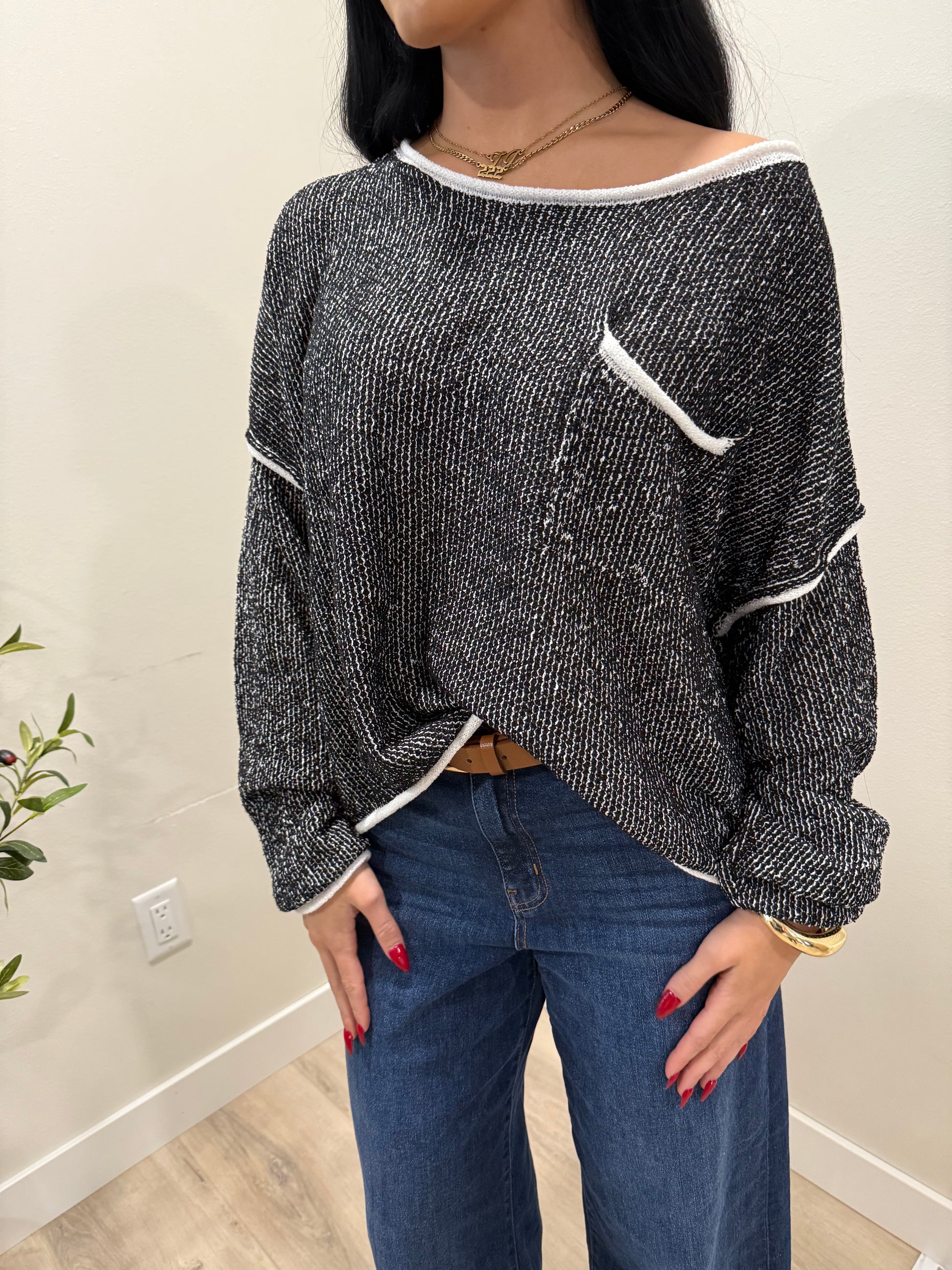 A lightweight textured sweater featuring contrast trim details along the neckline, cuffs, and hem. Designed with an easy, relaxed fit and dropped shoulders for a casual yet polished look.