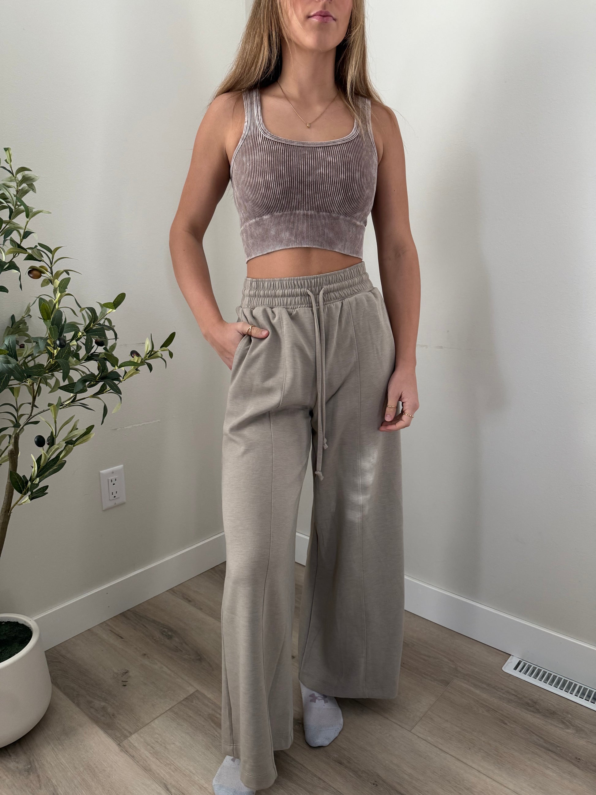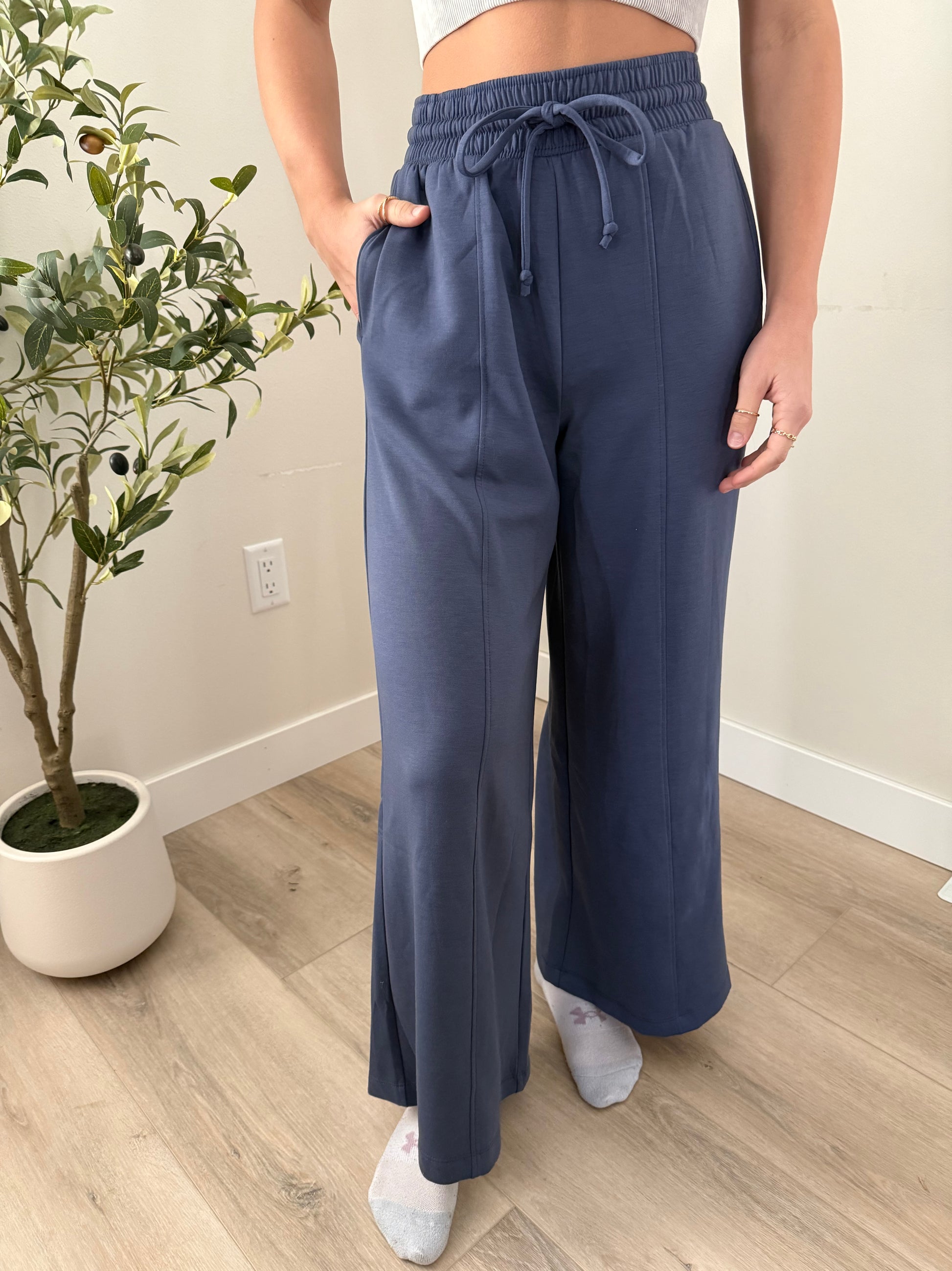 Scuba drawstring wide leg pants with a fun seam down the front. They are incredibly soft and ready to be dressed up for just lounging on the couch.